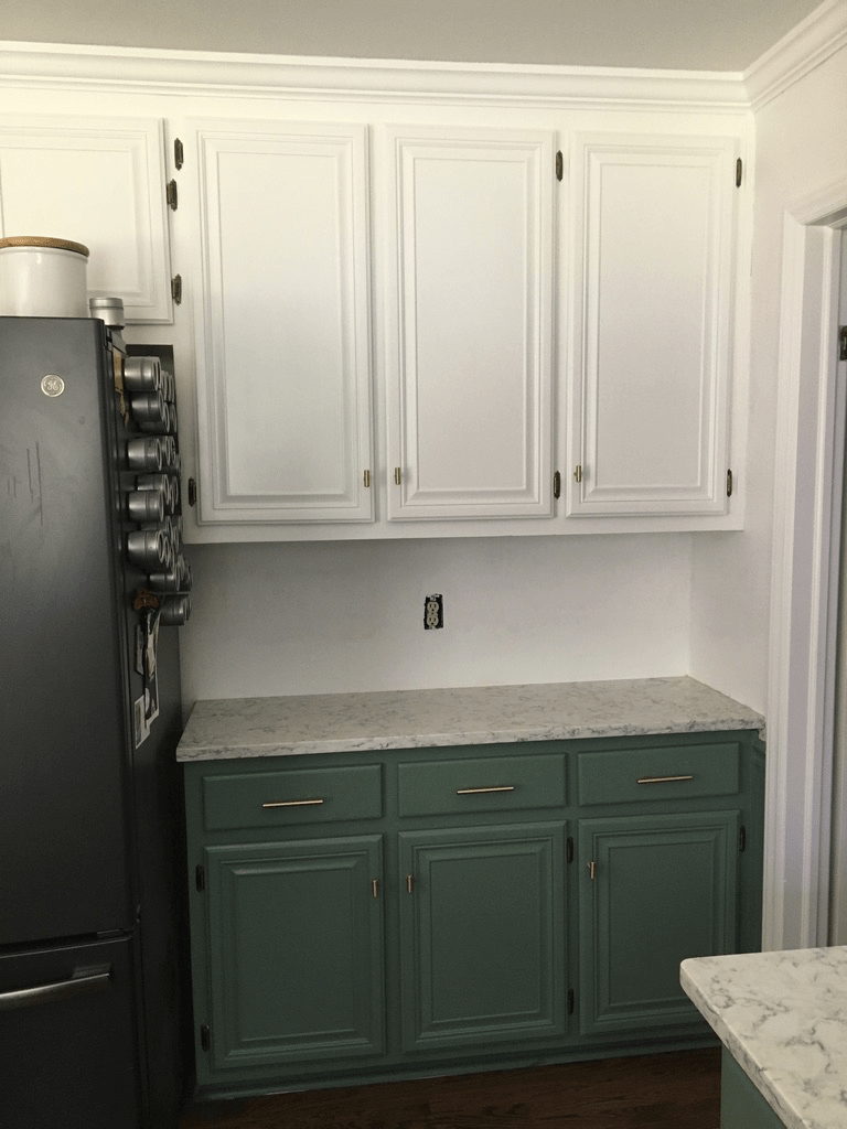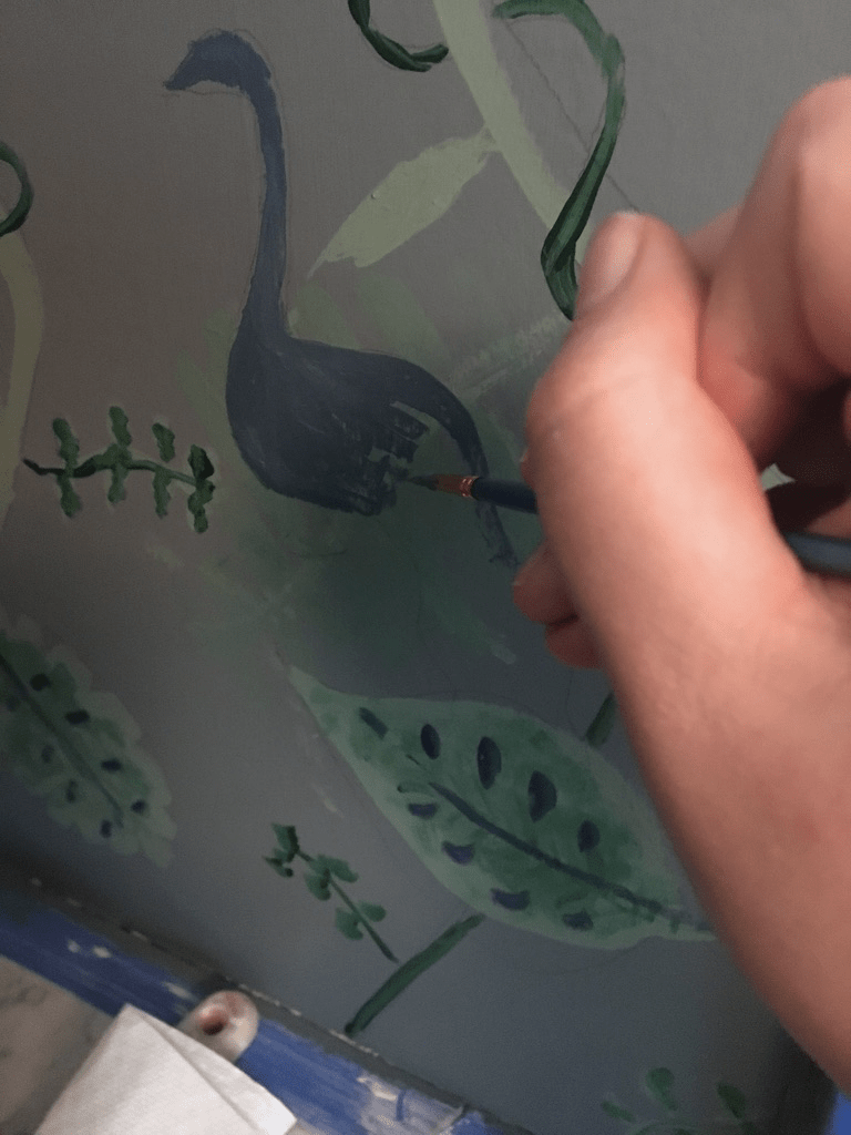 Then, I decided it needed something else. More color, more movement, more interest. I got out some of our other leftover paints: the kitchen cabinet colors, the blue from the bathroom, coral from the living room furniture. As I evaluated these paints, I wondered if I could mimic the look of wallpaper using those colors together. I referred to a design from Rifle Paper, Co as inspiration. I love a lot of their floral patterns and probably would have ordered their wallpaper if it had magically come in the exact colors I needed (https://riflepaperco.com/peacock-emerald-wallpaper-roll).