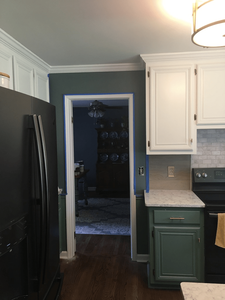 Anyway, once we brought our backsplash to its current state, we were left with a blank spot. A piece of wall around the doorway that leads to our mudroom/bonus room/laundry area. I like it when you look through a door and you can see the different spaces talking to each other. So, I painted that wall the dark grey color we had used in the mudroom space.