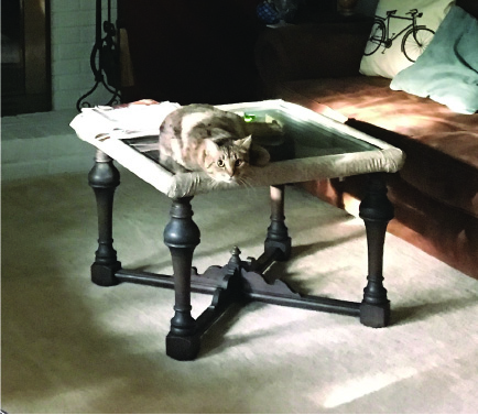 My latest furniture project has been a re-imagining of a piece that I built years ago. I like to take pieces of old furniture and put them together in new ways, and this particular table started off as a base and then a piece of glass that was being thrown away. I had to build a frame top to put the glass in, and then I decided to upholster it in a faux snake-skin vinyl. Quite a strange, bold choice, I’ll grant you. But it was fun.